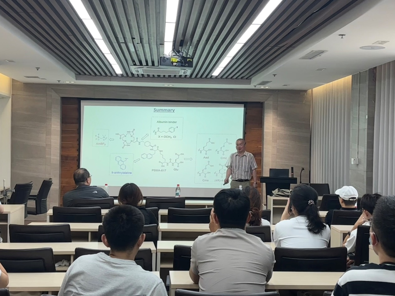 讲座中,林国贤教授以PSMA在前列腺癌病灶中的高度特异性表达为切入点,首先介绍传统PSMA探针在肾脏与唾液腺高摄取导致的诊断灵敏度不足、治疗剂量受限等瓶颈的背景,然后系统阐述新型Lys-urea-Glu药效团、连接子及白蛋白结合基团的优化策略,并重点介绍其团队自主开发的一系列诊疗一体化分子。其中[¹⁷⁷Lu]Lu-HTK03170已进入乳腺癌的Ⅱ期临床试验,[¹⁸F]HTK03162亦在加速向临床转化。林教授结合20余年放射性药物研发与转化经验,分享“从实验室到病房”的创新路径与实践启示。